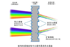 背投軟質(zhì)屏幕的材料為PVC,同樣需要處理屏幕表面材料和屏幕材料,投影光線從后面照射到屏幕并成像。 屏幕表面的光學(xué)因子對投影光學(xué)進行優(yōu)化,提高圖像質(zhì)量,光學(xué)因子多少和分布,決定了屏幕的增益、視角和分辨率。屏幕表面光學(xué)因子和其他色素,可以對投影畫面的色彩飽和度和畫面進行優(yōu)化。 2 硬質(zhì)屏幕的種類和技術(shù) 硬質(zhì)屏幕主要為漫反射光學(xué)硬幕和菲涅爾透鏡光學(xué)屏幕。
