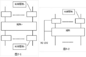 在無補償情況下,65Hz 1024×768分辨率的RGBHV信號(100MHZ)理論上用SYV-75-3的電纜傳輸僅僅為20米,SYV-75-5-1的電纜也只能傳輸30多米。但在工程實踐中多數工程商和用戶認為-6dB帶內損耗傳輸的圖像可以接受,-9dB帶內損耗傳輸的圖像能夠容忍,但群延時特性則必須進行延時預加重調整,以解決拖尾問題。 長線驅動用于解決工程中對信號遠距離傳輸的問題,一般認為,3+2或3+4電纜,距離應控制在20 m左右,75-5電纜應控制再50m左右,如大于此距離,就應采用長線驅動器進行補償。因工程中使用的電纜規(guī)格型號不同,其直流阻抗、等效阻抗、分布電容、電感等參數不同,因此,必須對不同的情況進行補償,理論上講,通過對電容、電感和電阻的調整可以解決,但實際應用中,電容、電感的可調范圍較小,而且要對R、G、B三路信號同時調整,且調整量要一致,因此要想實現(xiàn)連續(xù)可調難度很大,目前多采用預先設計好的網絡進行迭加,即進行分檔調整而不采用連續(xù)調整,但必須是可調整的,如果采用固定電路進行一定的補償,不可能符合現(xiàn)場的不同情況,不應稱為長線驅動器。該長線驅動補償設備根據不同規(guī)格電纜的衰減特性及電纜的不同長度,仿真電纜的反對數曲線特性,進行了分檔位的增益補償和群延時調整,該設備(VGAD-1*2CC/L、VGAD-1*2CC/LT)補償最多達8/16級(每級約15米),設備帶寬可達200MHz(未加補償),調整后傳輸系統(tǒng)帶寬可達80-120MHz。VGAD-1*2CC/L 8檔調整補償器針對10dB/100米、100MHz電纜,對參數進行優(yōu)化,在20m時起步調整,100m時達到最大,而VGAD-1*2CC/LT 16檔調整設備,在50m時起步調整,300m時達到最大,從目前看能滿足實際工程使用要求。 針對圖像不穩(wěn)定乃至黑頻等現(xiàn)象,該長線補償驅動器還對同步信號進行了數字校正(ADSP,該技術非本文討論重點,這里不做細述)。長線補償驅動器操作便捷,設備前面板上設計了觸摸按鍵進行補償檔位操作,此外,還增加了RS-232接口控制便于客戶利用中控或PC機對其控制,并能節(jié)省設備,如圖3-1,例中對矩陣切換器而言,輸入線的長度與輸出線的長度各不相等,進行補償時,原則上應在輸入部分采用不同的補償,以使輸入信號在矩陣入口時保持一致,由于輸出線長度又不一致,也應針對其采取不同的補償,設備較多,如果采用圖3-2的方案,在完成切換的同時,將輸入、輸出線長度的信息通知長線驅動器,令其按不同的長度進行補償調整,可節(jié)省設備,減少投資。