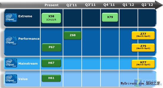 另一張芯片組路線圖也證明了新平臺的延遲。Z77、Z75、H77等三款與Ivy Bridge處理器配套的芯片組也都安排在3-4月份,分別取代Z68、P67、H67,但是入門級領(lǐng)域暫時繼續(xù)交給H61。