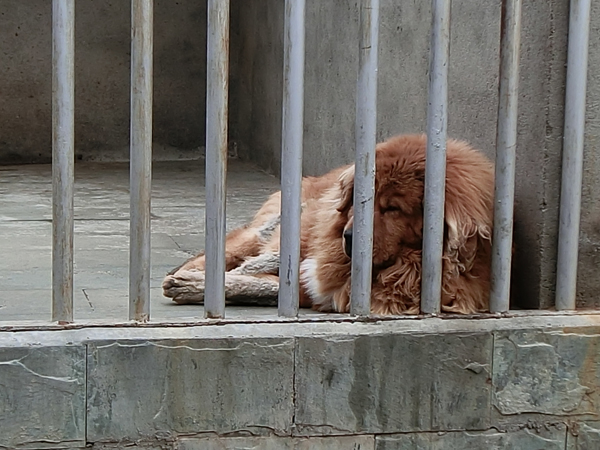 匆匆吃過9點(diǎn)鐘的午飯,繼續(xù)上路,在中午11點(diǎn)半趕到黃龍景區(qū)休息點(diǎn),關(guān)著很多藏獒供游客參觀,