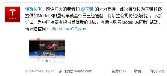 11月8日,特斯拉公司午間發布微博稱,特斯拉為天貓顧客提供的Model S限量現車截至已經售罄,今后消費者若需購買Model S或預約試駕,需登錄特斯拉官方網站。目前,天貓特斯拉旗艦店已關閉,所有車型信息均已下線,此前已交付定金的用戶,特斯拉會繼續為其服務直至整個服務完成。