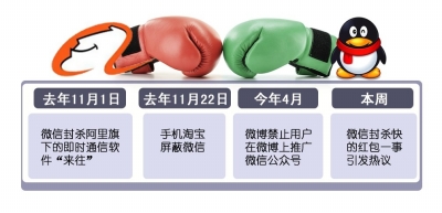 繼今年4月之后,25日晚,阿里入股的新浪微博再次對微信進(jìn)行封殺,禁止用戶利用微博推廣微信公眾賬號,到期沒有清除微信公眾號推廣的賬戶將可能面臨封號。這令外界聯(lián)想到日前曝出的微信封殺阿里旗下快的打車紅包一事。