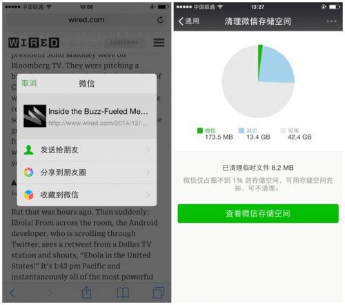 左:直接從Safari瀏覽器中分享內容到微信;右:清理微信緩存