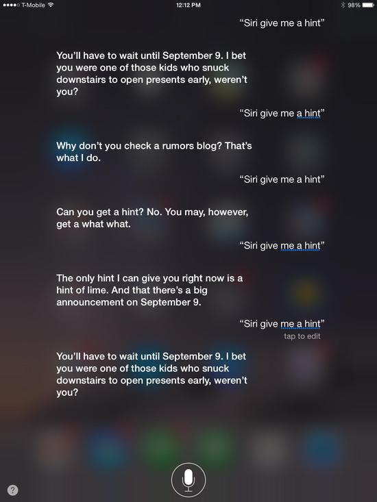 更準(zhǔn)確地說,Siri在回應(yīng)這個問題時真是又萌又調(diào)皮,她會讓這些“焦急的人”耐心等到9月9日去了解一切。
