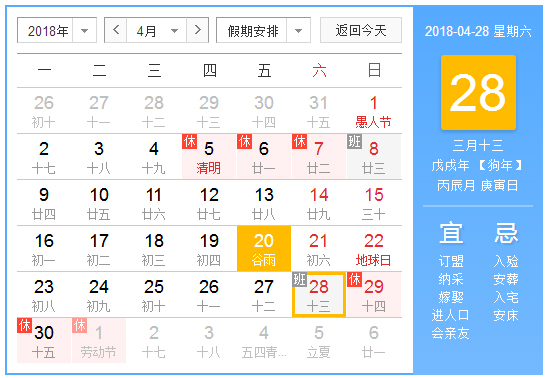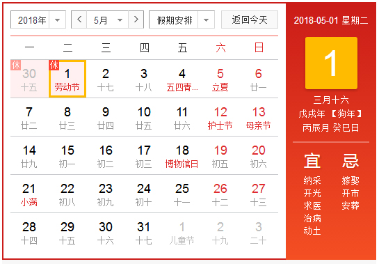 2018年4月29日至5月1日(星期二、“五一”國際勞動節)放假,共3天