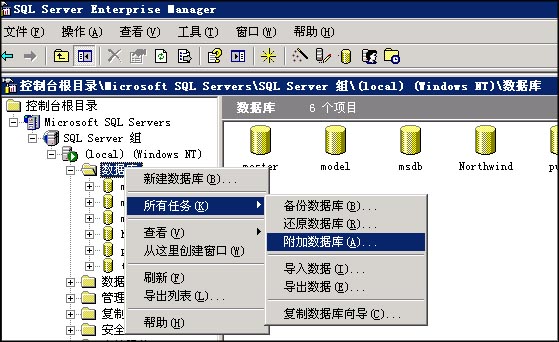 2、點擊“數(shù)據(jù)庫”--“所有任務(wù)”--“附加數(shù)據(jù)庫”,如圖: