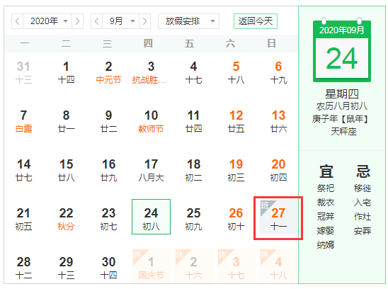 2020年10月1日(星期四)至 2020年10月8日(星期四)放假,共8天;