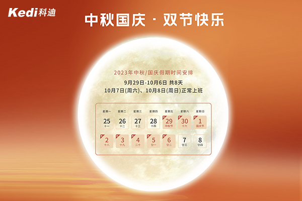 二〇二三年中秋及國慶節(jié)放假通知錦繡山河、共贏盛世!中秋國慶,雙節(jié)同至,大連科迪愿祖國繁榮昌盛,祝大家節(jié)日快樂! 2023年中秋節(jié)及國慶節(jié)放假具體安排通知如下: 中秋節(jié)及國慶節(jié)放假共8天(即9月29日-10月6日),10月